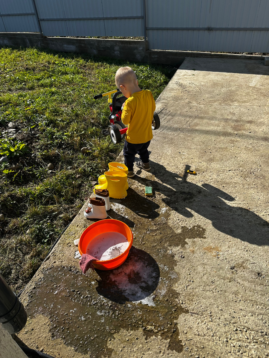 Наконец-то наши сибирские края посетило бабье лето, стало тепло, солнечно. Самое время смыть всю накопленную за лето пыль и грязь с окон и подоконников. Правда, это задачка со звездочкой, когда есть 6 окон в доме и двухлетка желающая помогать во всем. Пришлось жонглировать между двумя занятиями одновременно: сыну выдала тряпку из микрофибры, кусочек была, губку резиновые сапоги, машины и велосипед и таз с водой и лейку, а сама была занята делом. Окна у нас большие и с моим ростом 165см без стремянки не обойтись, принесла разложила и пошла работа: Окна были очень грязные, поэтому сначала я решила сначала смыть с мыльным раствором всю грязь, а потом перейти к чистовым работам. На чистоту решила не протирать всякими моющими средствами, скребками и тд. решила воспользоваться старым способом: вода и уксус на глаз- все высыхает без разводов! Но осилила помыть только с уличной стороны, дома решила отложить и помыть после установки дверей, намечаемых на завтра и послезавтра. Большие