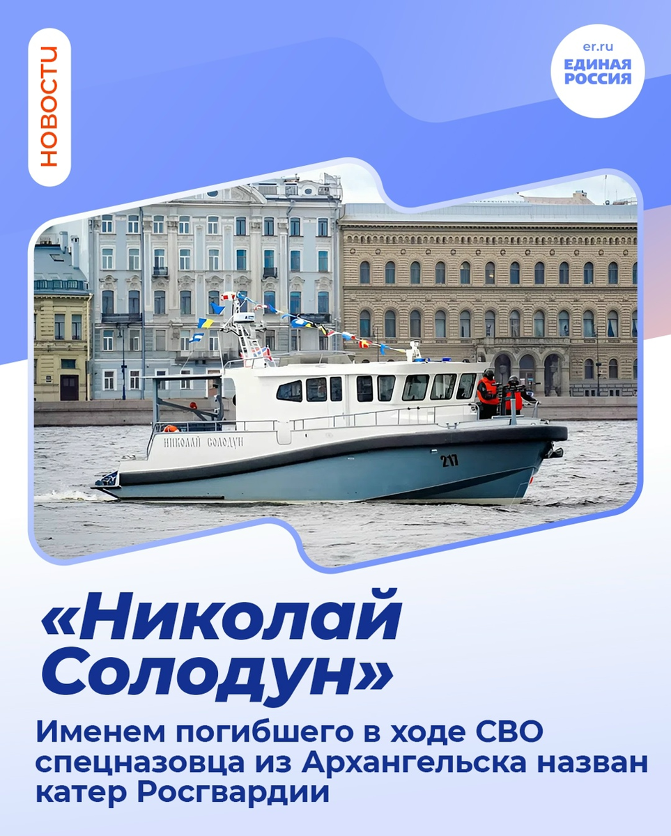 По поручению директора Росгвардии генерала армии Виктора Золотова в Санкт-Петербурге катерам ведомства присвоили имена героев — участников СВО и контртеррористических операций. Младший сержант Николай Солодун из архангельского отряда «Ратник» героически погиб, защищая Донбасс. За мужество и самоотверженность он посмертно награждён орденом Мужества. Вторая лодка названа в честь Героя России капитана милиции Владимира Усачева, погибшего на Северном Кавказе. Катера переданы ОМОН «Балтика» для обеспечения безопасности на Неве и Финском заливе. #ЕР29 #ЕдинаяРоссия #Архангельскаяобласть