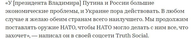 #повесточка Если убрать весь долгий текст Дональда и сократить в один короткий и емкий тезис: "Ребята ну вообщем воюйте до победного, а там как получится. Может да, а может нет, главное что я пытался, но вы меня не послушали" Каждая сторона услышала, что хотела услышать, а факт не очень хороший, что видимо пока мирные инициативы тормозятся и будем дальше дубаситься. Гражданам ЕС видимо надо готовиться тоже оплачивать за счет налогов поддержку 404. P.S.: Если что США антироссийскую резолюцию в ООН не поддержали. Что как бы намекает, кому мать родна, а кому война😀