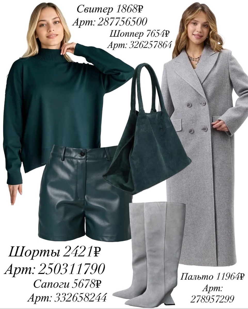Осень любит сложные оттенки и правильные фактуры. На этих коллажах — два мощных комплекта с Wildberries, которые выглядят дороже своей цены: прохладная капсула в изумрудно-серой гамме и элегантный офис-лук с карамельным пальто и шоколадным пинстрайпом. Разбираю каждую вещь по порядку и с артикулами, плюс даю рабочие лайфхаки стилиста. LOOK 1 — DEEP GREEN & GREY Арт.: 287756500 Плотный трикотаж с аккуратной стойкой, спущенным плечом и широкой резинкой по низу. Изумруд «подсвечивает» кожу и волосы, при этом не кричит — универсален и в офисе, и на выходные. Совет стилиста: делайте частичную заправку спереди — так проявится талия и ноги станут визуально длиннее. Арт.: 250311790 Матовая кожа без «пластикового» блеска, посадка по талии, длина прикрывает верх бедра — современно и не вульгарно. Боковые карманы держат форму и не добавляют объёма. Совет стилиста: надевайте графитовые колготки 40–60 den — они «свяжут» шорты с ботфортами/сапогами и стройнят ноги. Арт.: 332658244 Высокое голенище,