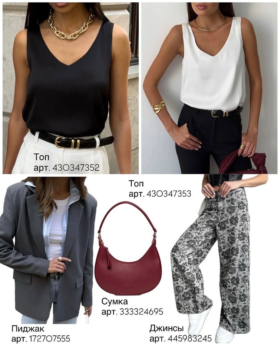 Два разных настроения — графичный «офис-стрит» и актуальный «жилетный» — собираются из доступных находок с WB. Ниже — каждая вещь строго по порядку с артикулами, подробностями посадки и точными советами стилиста, чтобы образ сидел безупречно. арт. 430347352 арт. 430347353 арт. 172707555 арт. 333324695 арт. 445983245 арт. 424784705 арт. 424784706 арт. 178142792 арт. 463012095 арт. 431960279 Секрет «дорогого» вида — чистая геометрия верха, правильная длина низа и один продуманный акцент. В первом луке таким акцентом становится бордовая сумка на фоне серо-чёрной графики и рисунка джинсов. Во втором — архитектурный жилет, который формирует силуэт и переводит джинсы из зоны повседневности в разряд «нарядно и современно».