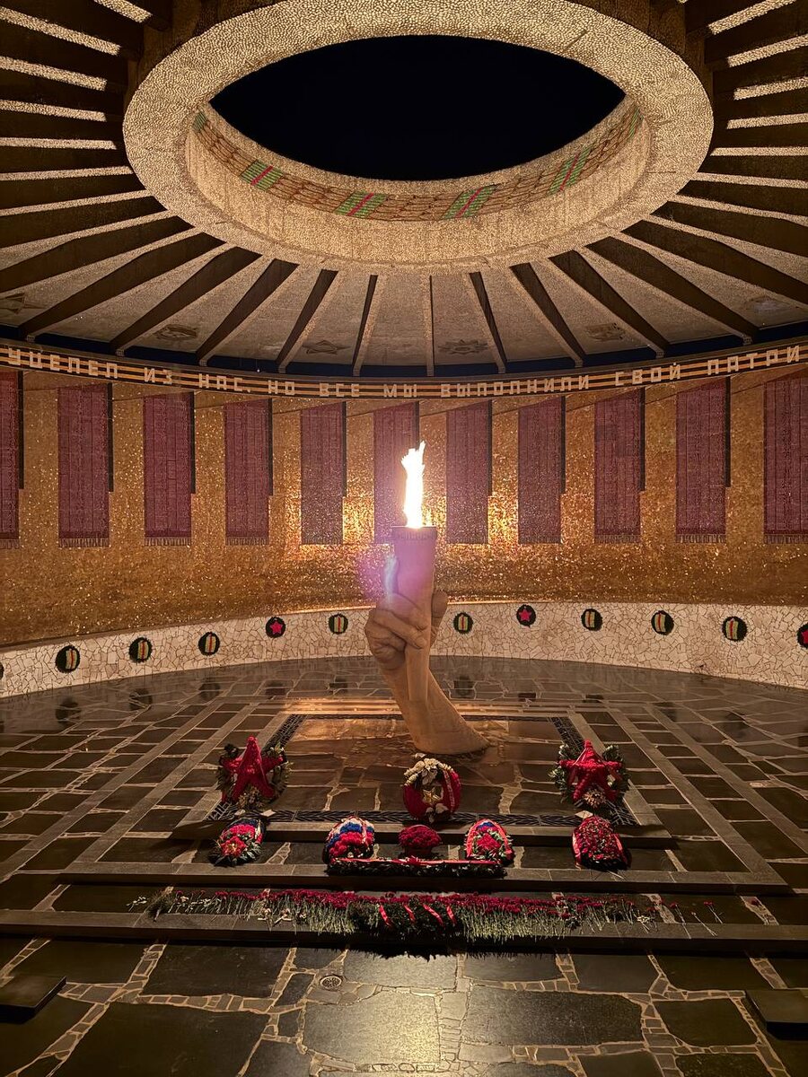 🌟 Ночной Мамаев курган: когда Родина-мать охраняет сон города...🛫 🌠 Есть что-то невероятно мистическое в ночном Мамаевом кургане! Когда статуя «Родина-мать зовёт» возвышается во всей своей величественности под светом прожекторов — сердце замирает от гордости и восхищения. 🧭 200 ступеней, ведущих к вершине кургана (столько же дней длилась Сталинградская битва!), словно приглашают пройти этот путь памяти и скорби. Каждая ступень — напоминание о подвиге наших предков. 🛋️ Ночью памятник выглядит особенно впечатляюще. Освещение подчёркивает каждую деталь монумента, а силуэт «Родины-матери» виден за много километров. Кажется, что она стоит на страже нашего покоя, охраняет сон города и всей страны. Высотой (примерном 30 этажный дом) 85 метров и весом более 8 тысяч тонн скульптура держится на пьедестале исключительно за счёт собственного веса и точного расчёта центра тяжести — никаких свай или болтов нет. Внутри монумента - металлический каркас весом 2400 тонн и 99 крепких тросов (св