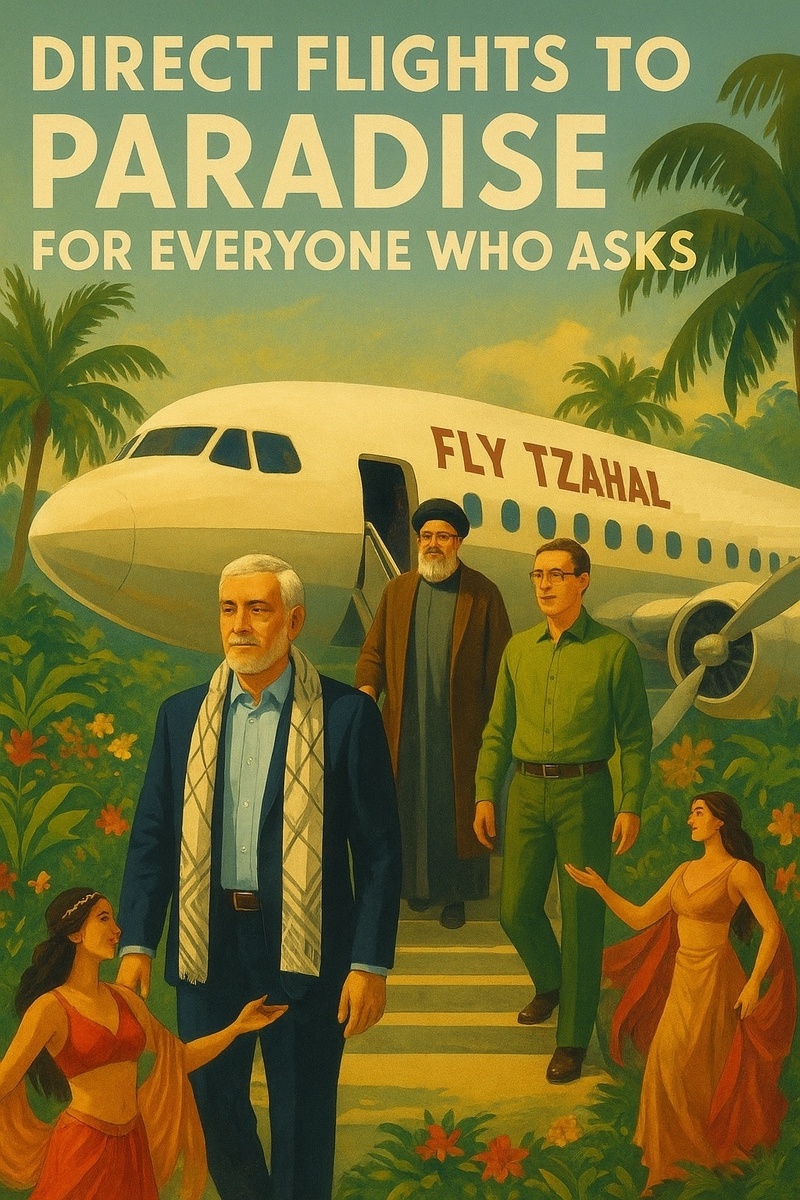 Как там было в шутке, можно ли простить врага? Б-г простит, наша задача организовать их встречу. Вот я собственно попробовал сгенерить саркастический рекламный плакат авиакомпании "Флай Цахаль", организующей такие встречи для разных бармалеев. Они хотели попасть к гуриям рая, они к ним отправились.