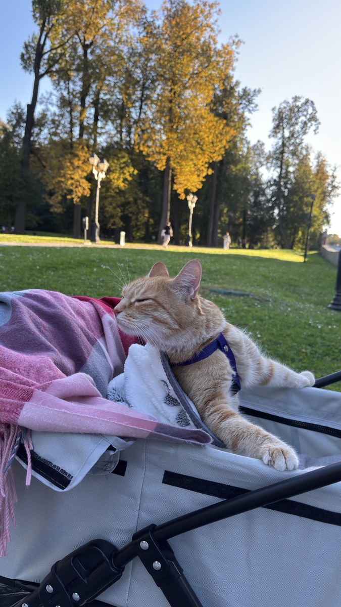 Первые минуты на новом месте. Василиса не спешит исследовать окрестности, а с важным видом осматривает всё с высоты своей коляски. Взгляд словно говорит: «Ну что, здесь всё в порядке?»