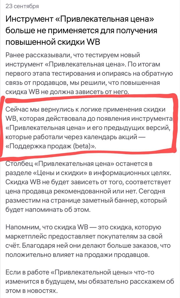 В ответ на пост 🥸 Сто шагов назад... Привлекательной цены больше нет) Если серьезно, то ее оставили, но она теперь никак не влияет на СПП (Скидка ВБ) Сейчас скидка WB неизвестно от чего зависит. Надеемся, что как и раньше, она будет у всех одинакова ±1%, а при цене менее 500 рублей - пропадает Нужно наблюдать, тестить P.S. Новость хорошая, на мой взгляд. Хотя бы одним «чудо-изменением» меньше