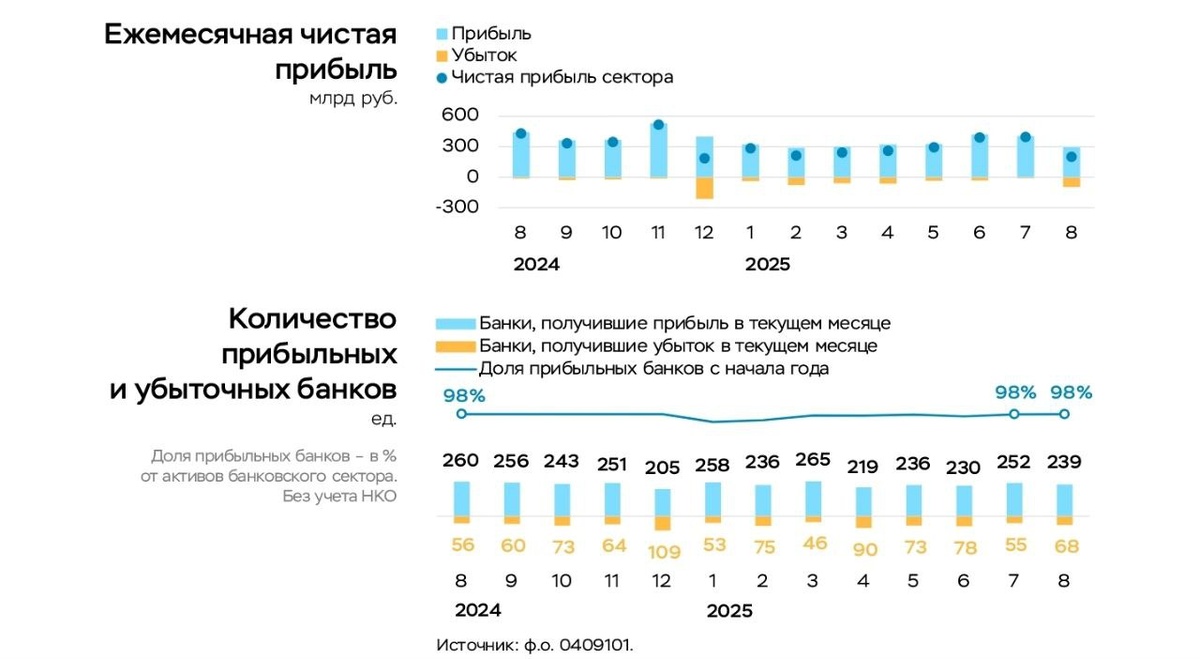 Развитие банковского сектора в августе Падение прибыли почти в 2 раза На сайте ЦБ РФ вышел обзор за август О развитии банковского сектора Российской Федерации Прибыль в августе упала почти в 2 раза за счёт роста резервов. Растут средства юр.диц и падают средства физ. лиц. Депозиты резко подросли на ₽1.4 трлн (+2.4% м/м и 8.4% г/г) Корпоративный кредит ускорился и вырос +₽1.2 трлн (+1.4% м/м, 10.1% г/г). Активнее начали занимать экспортеры, подрос валютный кредит +₽0.3 трлн (~$3.8 млрд).