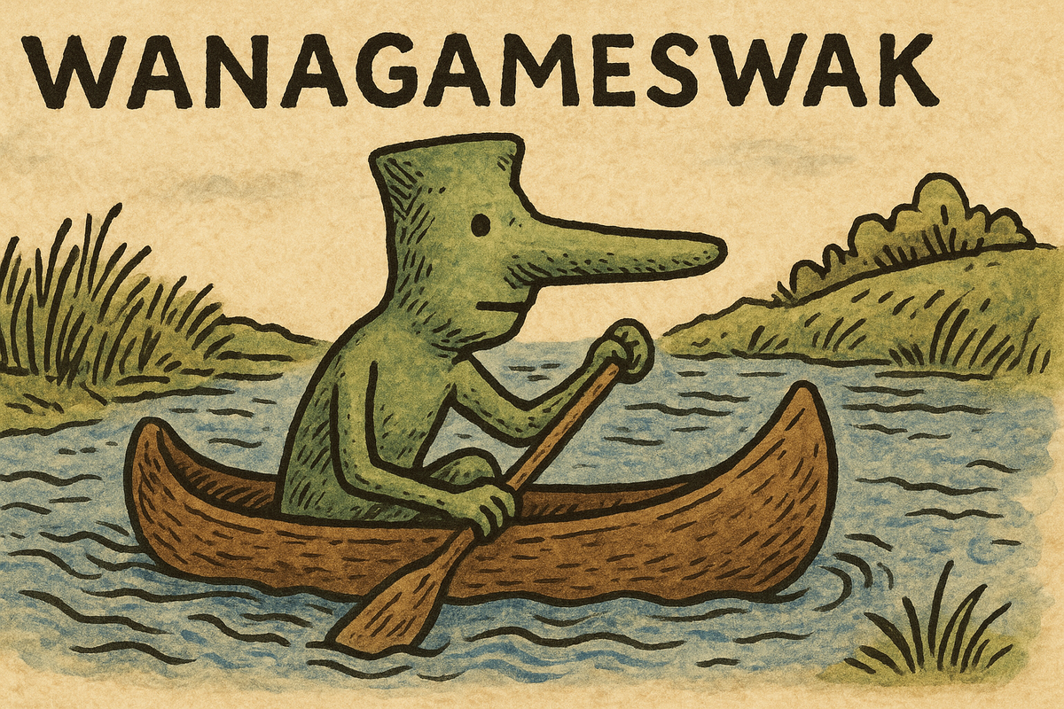 Ванагамесвак (Wanagameswak, Wanagamesak, Wana-games-ak) — это мифологическое существо из традиций племени пенобскот, проживавшего на территории северо-востока США и Канады. Эти маленькие гуманоидные духи связаны с водой: они обитают в реках и озёрах, иногда появляются в каноэ, а иногда слышны только по их веселому пению «hol hol!». Ванагамесвак отличается необычной внешностью: у него огромный нос, проходящий вдоль всего лица, плоская голова, напоминающая топор, и озорной нрав. По легендам, они были скорее доброжелательными созданиями: предупреждали людей о надвигающейся опасности, могли приносить удачу охотникам или рыбакам. При этом предпочитали избегать прямого контакта с людьми, оставаясь скрытыми. Эти существа также известны тем, что лепили из глины маленькие фигурки людей и животных и оставляли их на берегах рек. Найти такую фигурку считалось счастливым знаком. Таким образом, Ванагамесвак — это не чудовище, а скорее мифический дух-страж, напоминающий европейских водяных нимф, но с