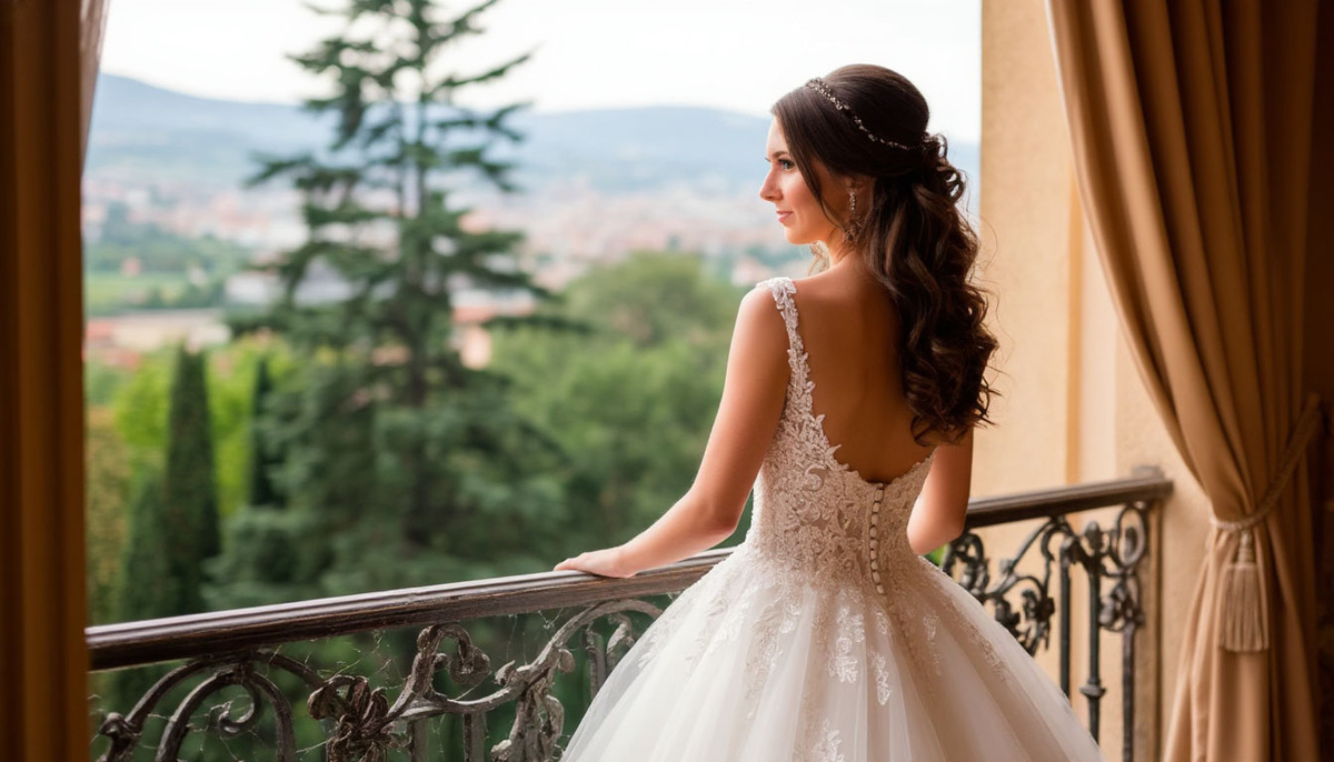 Платье было настоящим произведением искусства: шёлк цвета слоновой кости, усыпанный мельчайшим жемчугом и кристаллами, струился по фигуре, подчёркивая каждый изгиб. Корсет с тонкой шнуровкой создавал идеальный силуэт, а лёгкая юбка развивалась при каждом движении, как облако в лёгком ветерке.
