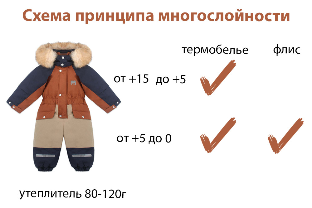 Данные приведены с учетом соблюдения принципа многослойности. Для малышей и малоподвижных детей рекомендуется выбирать одежду с большим количеством утеплителя.