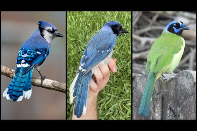 Сойки двух разных видов впервые начали спариваться. Кажется, из-за изменения климата. Биологи из США обнаружили сойку с очень странным окрасом (на фото она в центре) и доказали, что это гибрид двух разных видов, чье эволюционное разделение произошло где-то 7 миллионов лет назад. Необычную птицу назвали grue jay. Ее отец – самец голубой сойки (blue jay), а мать – самка зеленой сойки (green jay). Это подтвердил анализ ДНК. Скорее всего, из-за перепадов температур зеленые сойки – тропические птицы, обитающие в Центральной Америке, мигрировали на север, где и встретили голубых соек, живущих в умеренном климате на западе США. По словам ученых, это первый пример гибридизации позвоночных в результате расширения ареалов обитания двух видов по причине изменения климата.