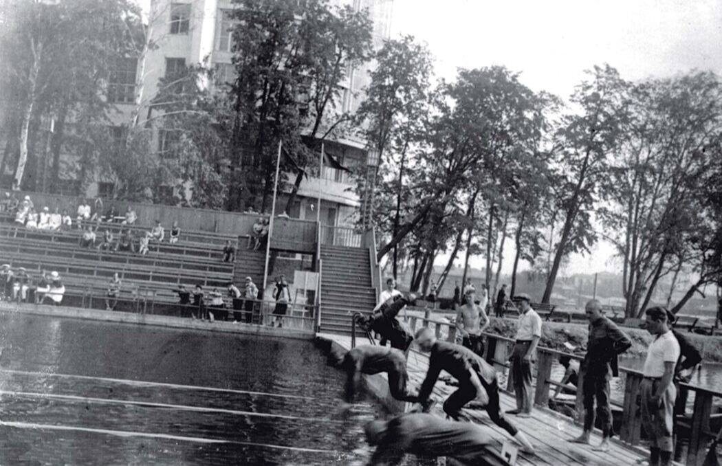 Водный стадион Водную станцию ввели в эксплуатацию в 1932 году; она включала четыре бассейна — два для соревнований и ещё два, предназначенные для детских купаний. На объектах были установлены вышки с трамплинами для прыжков в воду. При станции также располагалась лодочная база, а трибуны для зрителей стояли на берегу напротив. Фото 1935-1939 год.
