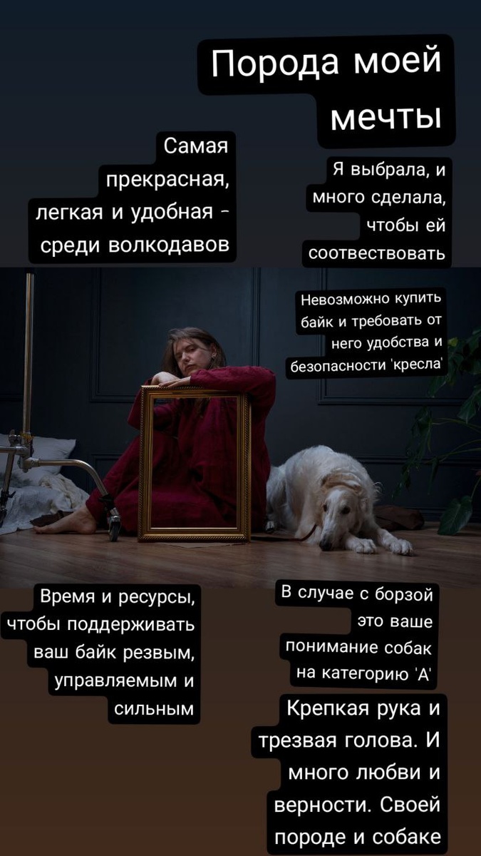 Делюсь с вами этой сториз. На самом деле, это затравка и обещание мне самой себе, что пора написать искренний и глубокий, но вместе с тем непростой пост. О моей точке зрения на путь героя. На путь становления настоящего владельца русской псовой борзой. И того, кто достоин и готов к этой собаке не только на материальном, временном и бытовом уровне Но и на уровне психологической зрелости, грамотности и ответственности. Что уже не так очевидно. Скорее всего, это будет цикл глубинных постов на подумать. И это прежде всего, о моей этической позиции в адрес того, каких людей я считаю действительно психологически зрелыми. А общаться и сотрудничать я хочу в первую очередь, с такими людьми Ведь собака для меня не мешок картошки, не авторская кружка и не спортивный инвентарь. Это друг и живая душа. Мы в ответе за тех кого приручили. Как и. за то, кем мы становимся в процессе приручения. Да, с ошибками, неидеальностями, полутонами и большими вопросиками к себе. Которые решаются тем или иным спо