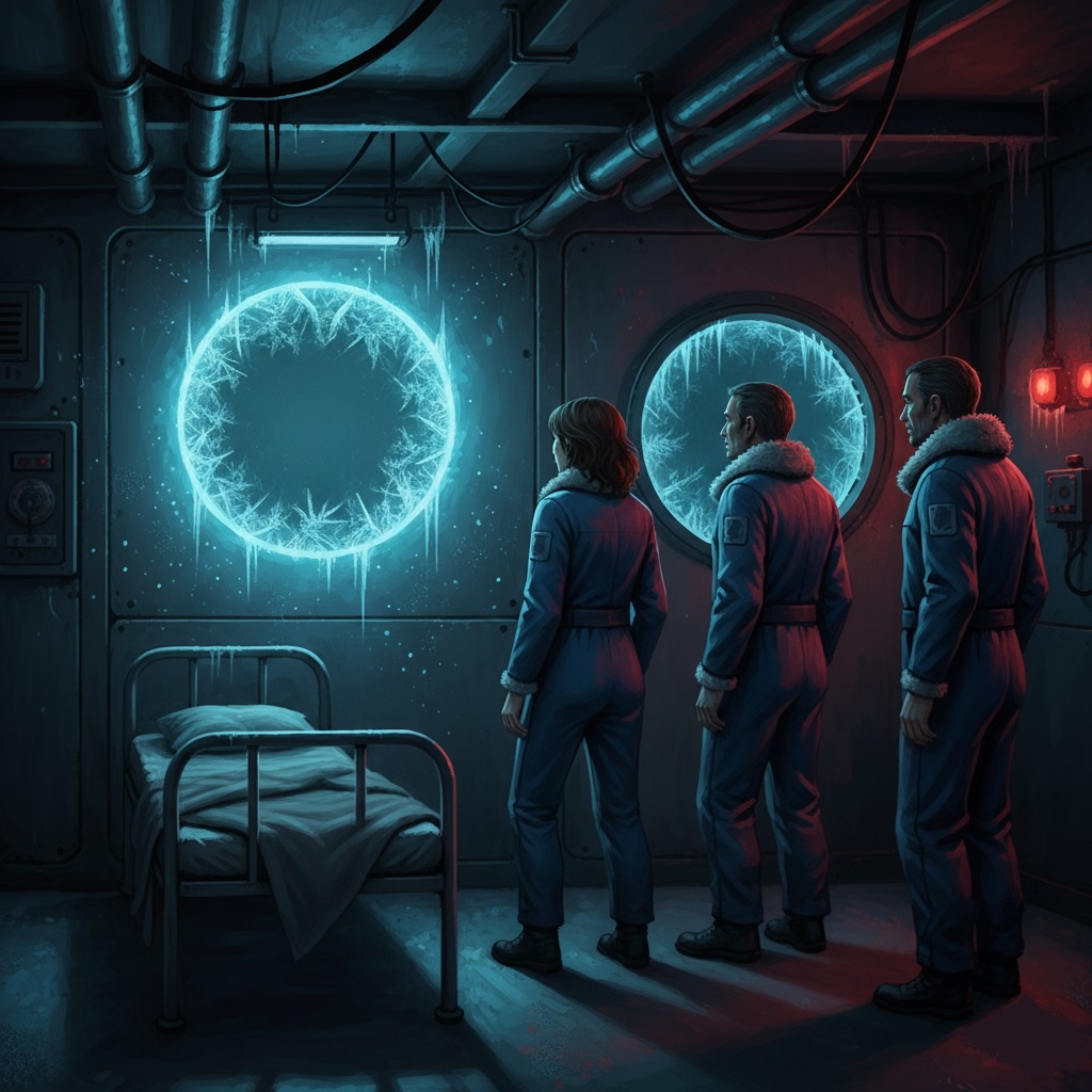 Тишина после исчезновения Марии была хуже любого звука. Она была тяжёлой, густой, насыщенной незримым присутствием. Трое оставшихся стояли в пустой каюте, глядя на ледяной круг - печать небытия, оставленную на стене. Он не таял, хотя в модуле было далеко не минус шестьдесят. Он просто висел там, холодный и совершенный, как око нездешнего существа.