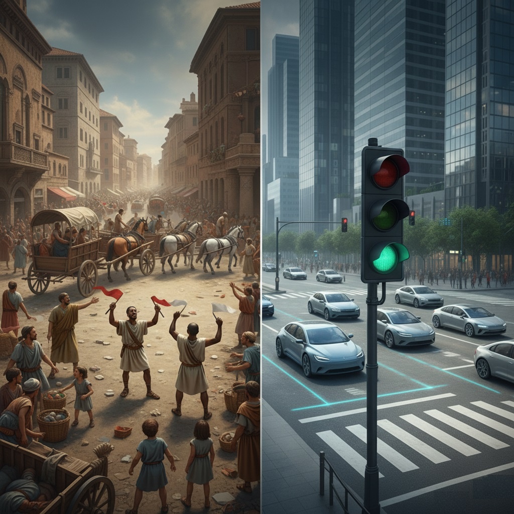 Представьте мир без правил дорожного движения. Повозки сталкиваются на перекрёстках, пешеходы ныряют под колёса, а водители ругаются на непонятном языке жестов. Хаос? Именно так и было до тех пор, пока человечество не осознало, что движением нужно управлять. Как появились первые регулировщики, кто придумал светофор и почему древнеримские «гаишники» были самыми крутыми? Давайте разбираться.