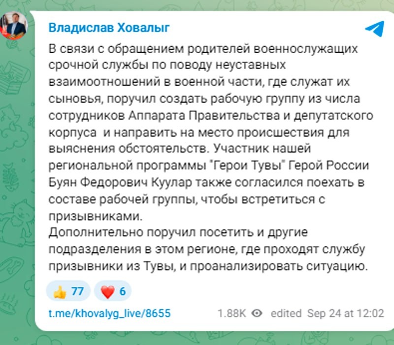 Неуставные отношения в воинской части проверит глава Тувы Родители тувинских срочников заявили о неуставных отношениях в одной из воинских частей, сообщил глава республики Владислав Ховалыг в своём телеграм-канале. «Поручил создать рабочую группу из числа сотрудников аппарата правительства и депутатского корпуса и направить на место происшествия для выяснения обстоятельств. Участник нашей региональной программы ''Герои Тувы'' Герой России Буян Куулар также согласился поехать в составе рабочей группы, чтобы встретиться с призывниками», — написал Ховалыг. Чиновник также поручил проинспектировать другие воинские части с призывниками из Тувы «в этом регионе». Но Ховалыг не уточнил, в каком именно регионе находятся все части. Подписаться| Прислать новость| Помочь бустами