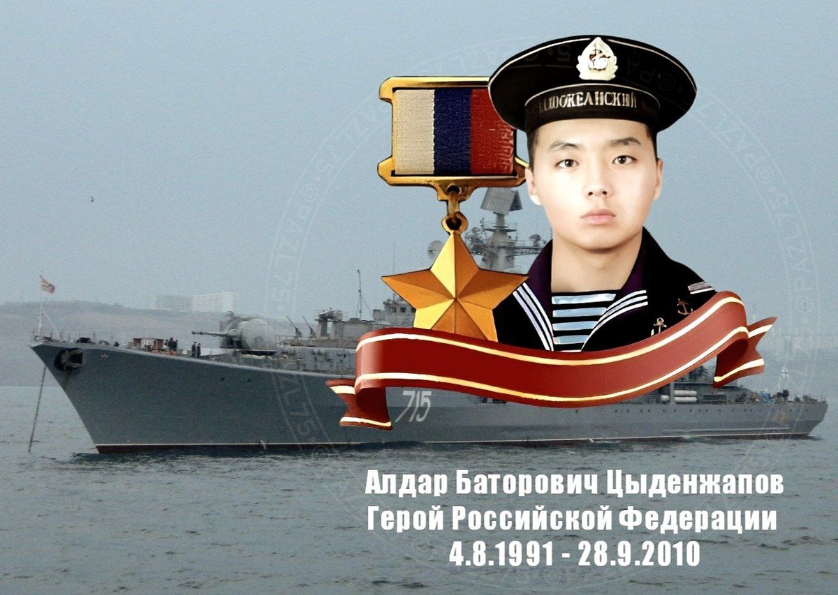 Алдар Баторович Цыденжапов (4 августа 1991, Агинское, Бурятская АССР — 28 сентября 2010, Владивосток, Приморский край) — российский моряк, матрос Тихоокеанского флота России. 24 сентября 2010 года, когда весь экипаж эсминца «Быстрый» находился на борту и готовился к боевому походу из Фокино на Камчатку, в машинном отделении корабля вспыхнул пожар из-за замыкания электропроводки в момент прорыва топливного трубопровода. Цыденжапов, заступивший на дежурство в качестве машиниста котельной команды, сразу кинулся перекрывать утечку топлива. Около девяти секунд он находился в центре пожара. После устранения утечки он смог самостоятельно выбраться из охваченного пламенем отсека, получив сильнейшие ожоги. Благодаря героическим действиям 19-летнего матроса был спасён и эсминец, и 348 человек из его экипажа. При этом сам Алдар Цыденжапов сильно обгорел, и врачи боролись за его жизнь четыре дня. Указом Президента России от 16 ноября 2010 года №1431 матросу Алдару Баторовичу Цыденжапову за