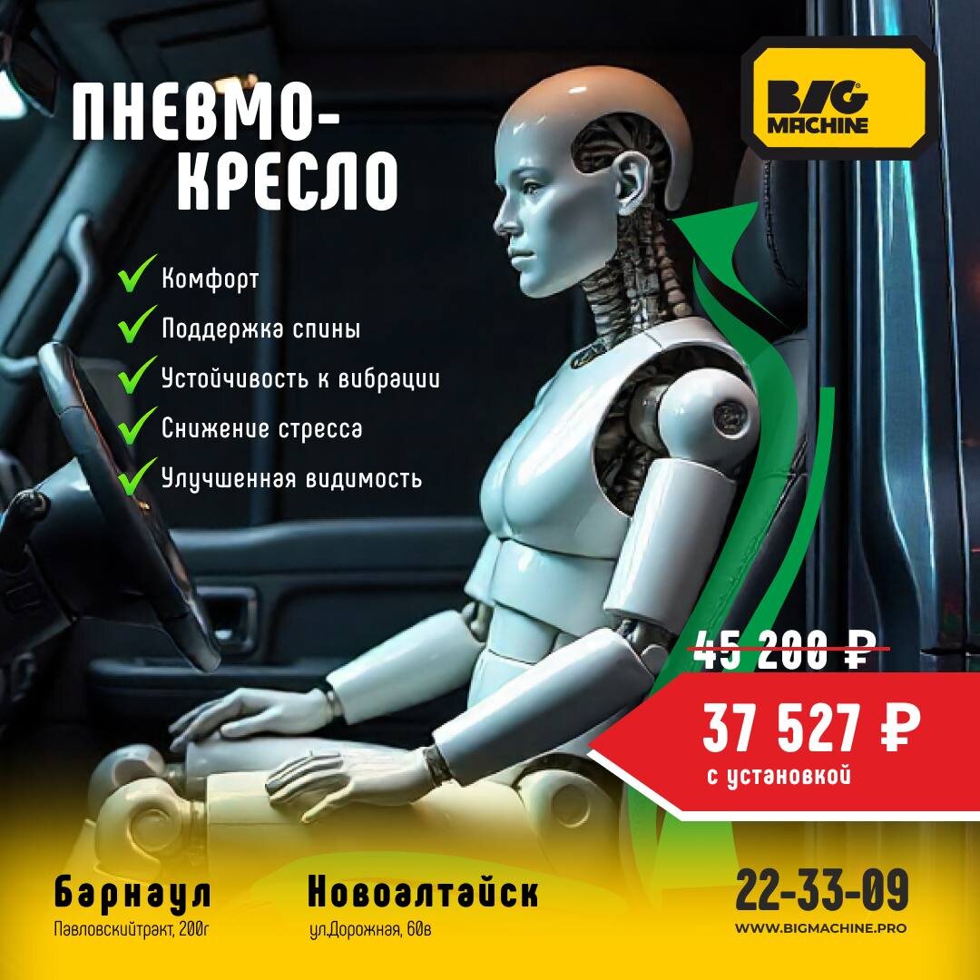 Комфорт, который вы заслужили! 🔥 🚛 Пневмокресло с установкой за 37 527₽ Долгие часы за рулем не должны превращаться в испытание. Пневмокресло – это: ✔ Мягкий ход – амортизирует удары и вибрации. ✔ Индивидуальные настройки – регулировка высоты и наклона одним нажатием. ✔ Уменьшение нагрузки на спину – меньше усталости, больше комфорта. 📌 Акция ограничена! Успейте забронировать установку 📞 +7 (3852) 22-33-09 Ждем вас по адресам: 📍 г. Барнаул, Павловский тракт, 200г 📍 г. Новоалтайск, ул. Дорожная, 60в