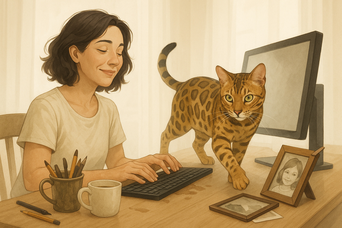 С виду — милое создание в золотой шкуре с идеальными чёрными розетками, но не стоит обманываться по внешности. Тем не менее мы нашли общий язык. Именно он — мой главный критик и, как ни странно, двигатель моего мыслительного процесса. Сегодняшний день был классическим примером творческого тупика. Я сидела перед экраном, на котором застыл пустой лист. Дедлайн подкрадывался, как Макс к моим ногам под столом, идей нет. Мысли путались, образуя серый, бесформенный клубок в голове. Я чувствовала, как нарастает глухое раздражение, знакомое каждому, кто пишет. В этот момент на стол