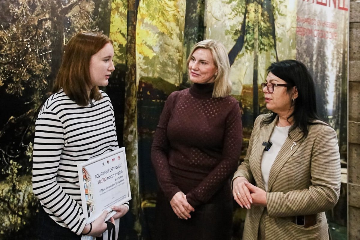 Юная прокопчанка стала десятитысячным посетителем выставки Ивана Шишкина. Музей изобразительного искусства Кузбасса встретил десятитысячного гостя выставки Ивана Шишкина. Им стала юная жительница Прокопьевска и ученица 4 класса ДХШ №8 Анастасия Самарцева. Девочка даже не подозревала, что её билет окажется десятитысячным и откроет не только дверь в мир шедевров великого художника, но и целый сундук сюрпризов. Директор музея Ольга Широкова вручила ей сертификат на бесплатное посещение музея до конца 2026 года, альбом с репродукциями из музейной коллекции и стильный блокнот, чтобы первые художественные мысли находили своё место на бумаге. От Русского музея прокопчанке вручили сувенирную продукцию. Анастасия купила билет онлайн — по Пушкинской карте. Напомним, выставка Ивана Шишкина работает в Кузбассе с конца августа. Всего представлено 40 шедевров из собрания Русского музея. Они охватывают разные периоды творчества мастера: от первых законченных полотен до пейзажей 1890-х годов. ПОД