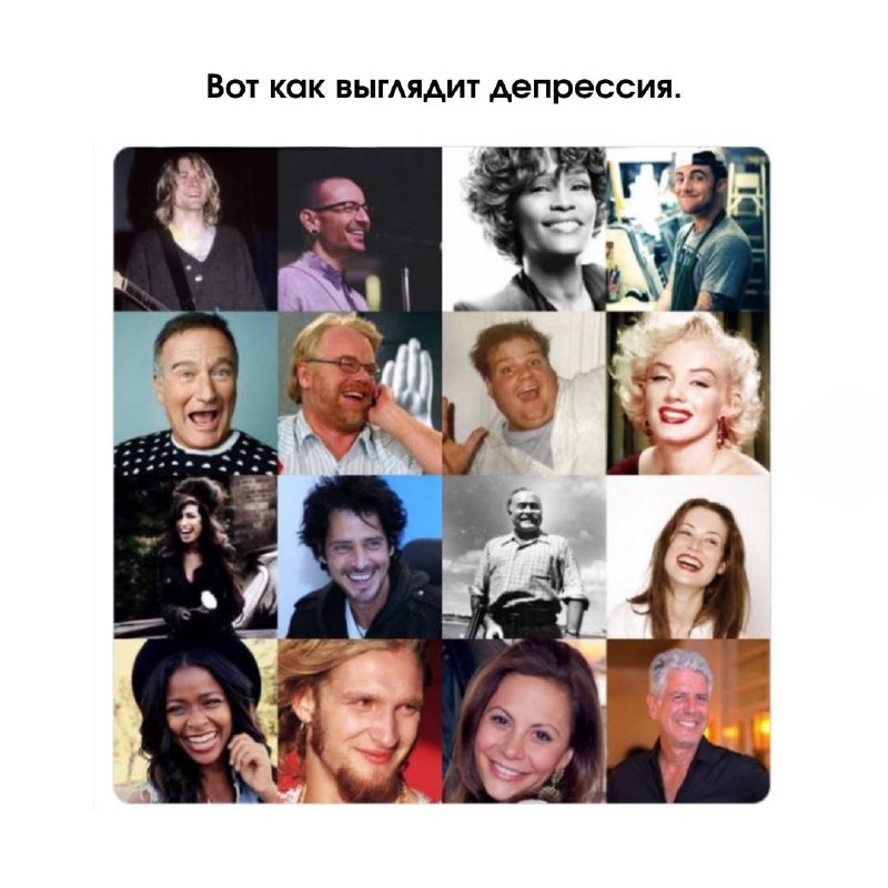 Понравились картинки в другой соц.сети. Забрала сюда. Решила написать пост. Депрессия бывает не видна! Это правда. Мы часто представляем человека в депрессии унылым, грустным, плачущим. Но это не обязательно так. Самое страшное, когда человек в обществе и даже в кругу близких весел и бодр, носит ту маску личности, которую, как ему кажется, люди ожидают увидеть. Чтобы не беспокоить, не привлекать внимание или потому, что не может по-другому. Диагностировать депрессию может помочь концепция А.Бэка: Бек определяет три области негативного мышления, которые закрепляютв депрессивную картину мира: 1. Негативный взгляд на СЕБЯ 2. Негативный взгляд на МИР 3. Негативный взгляд на БУДУЩЕЕ 👉Негативный взгляд на СЕБЯ Всепроникающее чувство неполноценности, неадекватности и некомпетентности, жесткая самокритика. Причем никакие внешние успехи и доказательства в обратном не могут их разубедить в собственной никчемности. Люди в депрессии считают себя недостойными любви, они не верят комплиментам