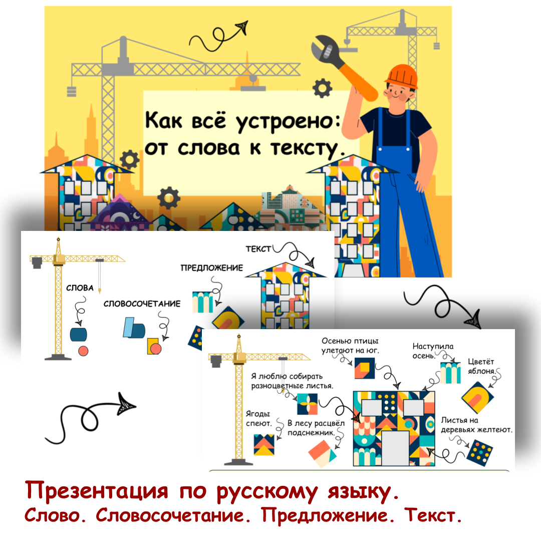 Презентация по русскому языку «Как всё устроено: от слова к тексту». Данная презентация разработана по теме «слово, словосочетание, предложение, текст» для учащихся второго и третьего классов. Презентация построена по принципу образно-наглядного представления изучаемого материала. Такое представление позволяет учащимся в виде образных ассоциаций лучше усвоить материал. Презентация оформлена в теме строительной площадки, где строятся различные дома-тексты. Строительным материалом для домов-текстов являются предложения, которые в свою очередь строятся из словосочетаний, а словосочетания - из слов. В презентации приводятся следующие понятия: Презентация позволяет обобщить знания учащихся по смысловому связыванию слов от словосочетания к тексту, представляя объёмную картину, или же ознакомить учащихся на начальном этапе изучения темы с общей картиной, как связываются слова по смыслу в более крупные смысловые элементы. Презентация включает в себя 13 слайдов, включая 2 обложки. Скачать през