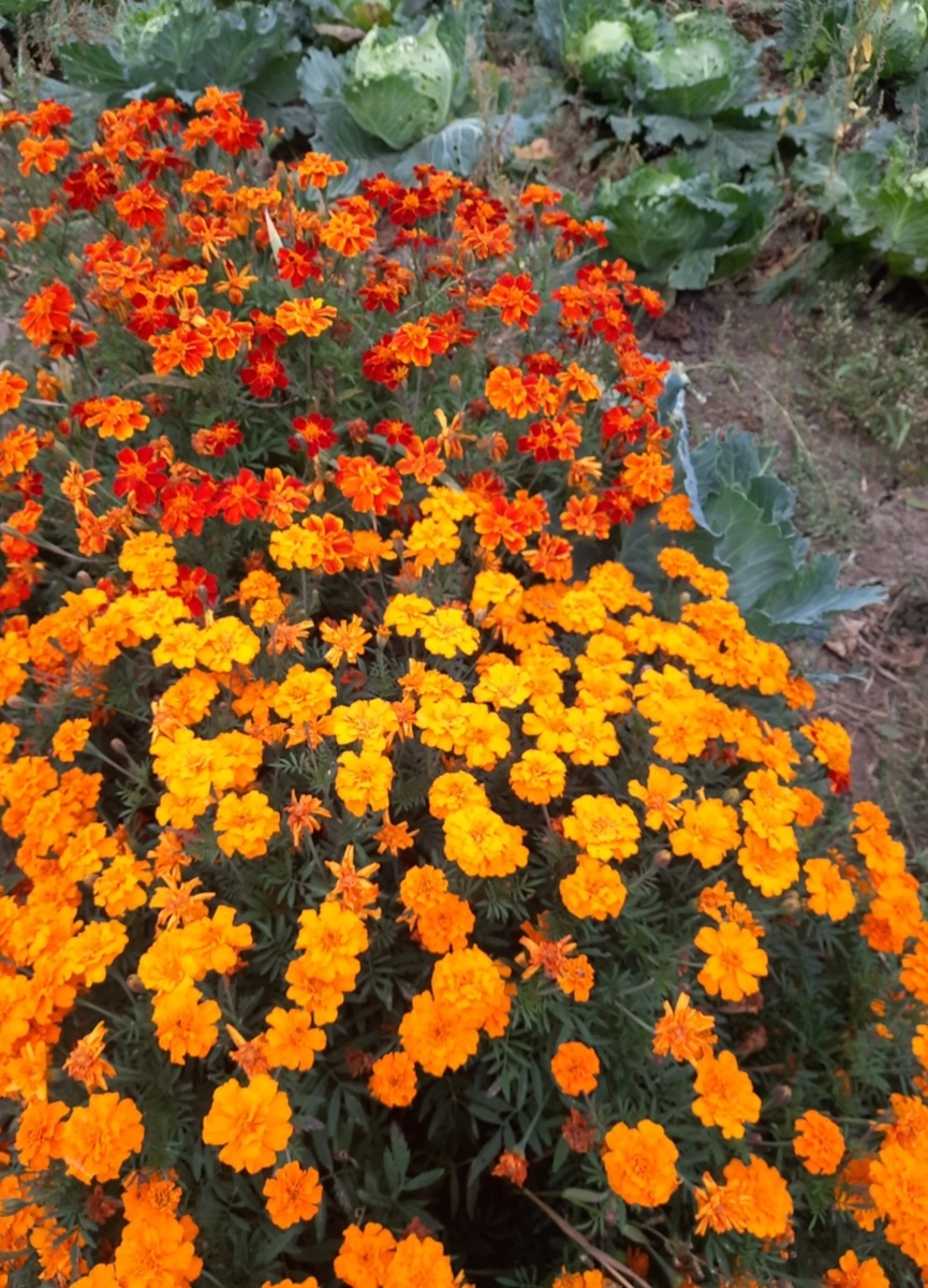 Бархатцы - это настоящие осенние цветы. Они ещё известные как тагетесы, относятся к роду цветковых растений семейства астровых. Эти яркие, неприхотливые цветы завоевали популярность среди садоводов и любителей флоры. Бархатцы отпугивают всяких вредителей в огороде, борются с опасными нематодами, которые губят урожай. Своими корнями растения рыхлят землю, а когда перегнивают — становятся отличным удобрением. Кстати, мы укрываем озимый чеснок их стеблями. Предлагаю Вашему вниманию посмотреть на наш осенний оазис бархатной красоты >>> К удивлению большинства людей, цветки бархатцев съедобны. Их можно использовать на кухне в свежем и сушеном виде для различных блюд и напитков, но главное достоинство бархатцев — их удивительная способность расти и цвести практически в любых условиях. Спасибо за внимание! Понравилась моя статья поддержите её лайком 👍🏻( палец вверх) и подписывайтесь на мой канал🏵