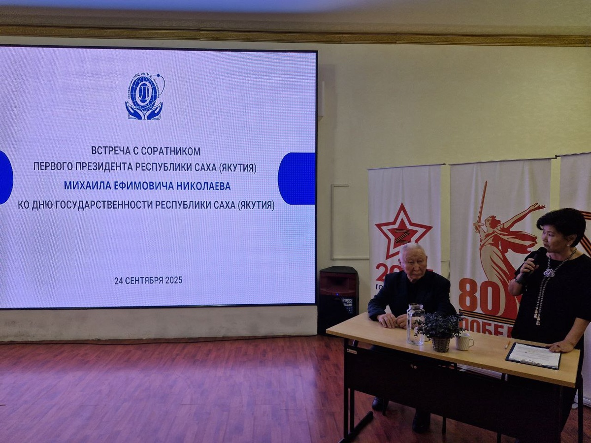 С Матвеем Васильевичем Мучиным принимаем участие на торжественном мероприятии в Октемском НОЦ им. М.Е. Николаева, посвященном Дню государственности Республики Саха и 35-летию принятия Декларации о государственном суверенитете Якутской-Саха ССР в составе Российской Федерации.