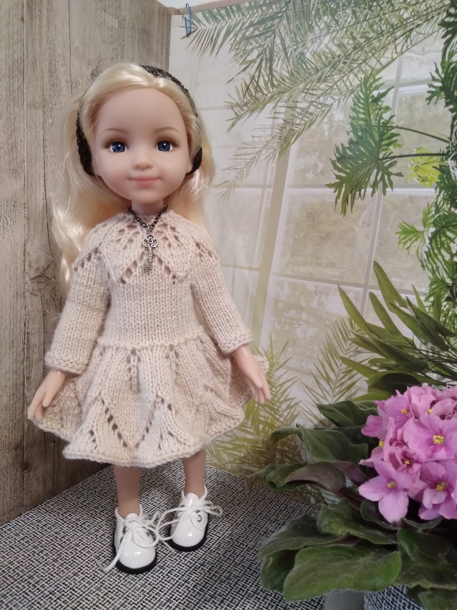Всем привет! Я тут пообещала описание платья с листиками на Паолу. У меня получилось два варианта и по сему вопрос - которое описывать? Мне в принципе все равно. А какое вам больше нравится? Бежевое? Или голубое? Кстати, наряд на Симону к Хеллоуину тоже готов. Получилось по канонам праздника - мрачновато, немного небрежно (носочная пряжа грубовата)) и с соответствующими аксессуарами. Пряжа носочная, немного странные переходы цвета, на рукава идеально подобрать не получилось, поэтому и фактура такая неоднозначная. Вам как? Кстати, если кто надумает вязать, стучитесь в комментариях. Топик из набора от Lara "Лолита", но, думаю, буду пересчитывать. С описаниями разрулим), например, покажу свои записи в тетради. Юбочку я переделывала, поэтому могу дать описание. А шляпу и гетры вязала по собственным расчетам, поэтому могу описать подробно. А помните платьишко на Паолу с бантиком и юбочкой гофрэ? Я примерила на Мию и очень даже подошло! И вот еще фоточка про Мию и мини-Мию. Для сравнения так