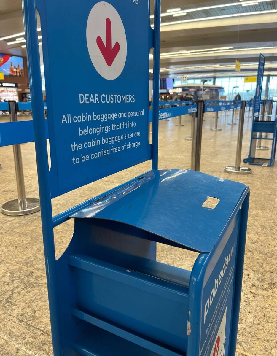 Посмотрите на выгнутую крышку этого калибратора для ручной клади и угадайте авиакомпанию ✈️ Мне кажется, в этом фото целая история. Глядя на эту крышку, я представляю себе, как люди остервенело заталкивали свои сумки и рюкзаки в калибратор и с силой давили на крышку, чтобы пройти контроль.