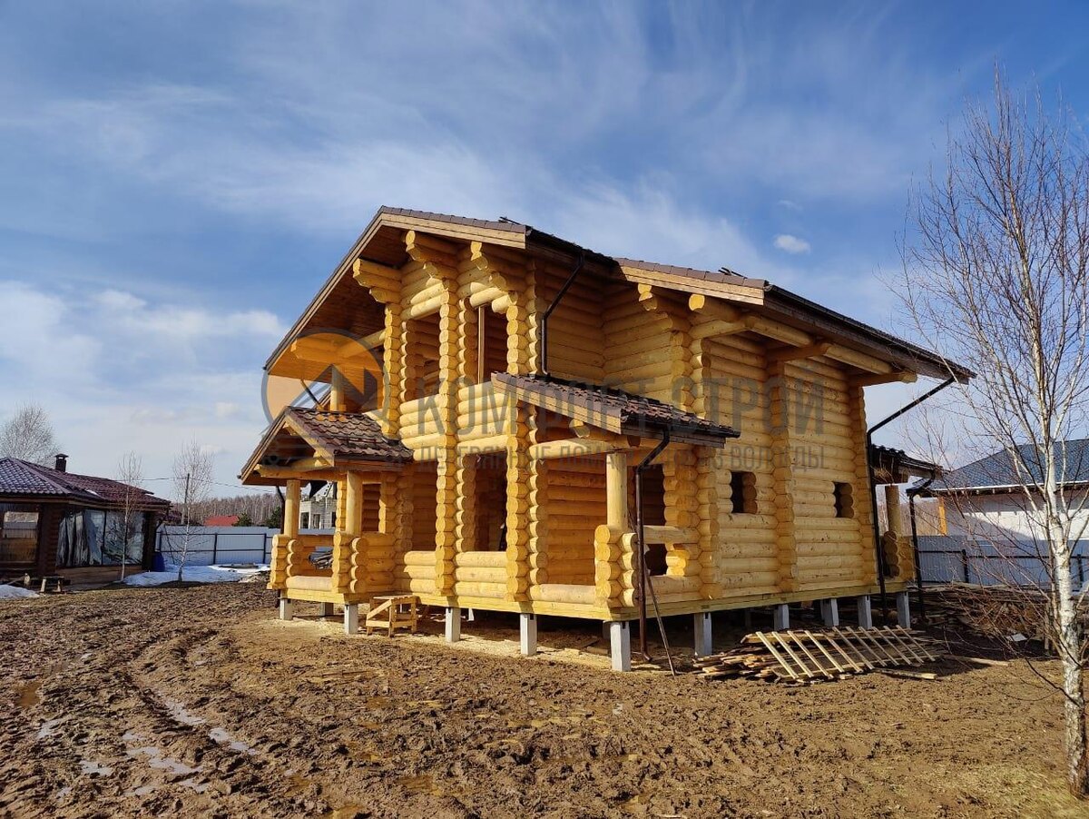 Дом по проекту "Тайга 2" из оцилиндрованного бревна. Размер: 11.5 х 11 м Площадь общая: 153.4 м2 Площадь жилая: 94.1 м2 Место строительства: д. Сокольниково в Чеховском районе Московской области Дом "Тайга 2" идеально подходит для большой семьи. В нём может удобно расположиться семья из 5-6 человек. Площадь дома позволяет распланировать территорию, так, что своя комната будет у каждого члена семьи. В проекте 4 спальни. Крыльцо дома большое, сверху продуман большой козырек, который оградит от дождя и снега. С гостиной предусмотрен выход на террасу, она расположена вдоль первого этажа. Большие окна есть как на перовом, так и на втором этаже – это позволяет большому количеству света беспрепятственно проникать в дом. Второй свет в гостиной увеличит пространство. Сан. узел на 1-м и 2-м этаже, отдельные гардеробные, терраса и балконы из спален - всё это для комфортной жизни. В тех. помещении есть отдельный вход. Это помещение, в котором сосредоточены отопительные и водонапорные коммун