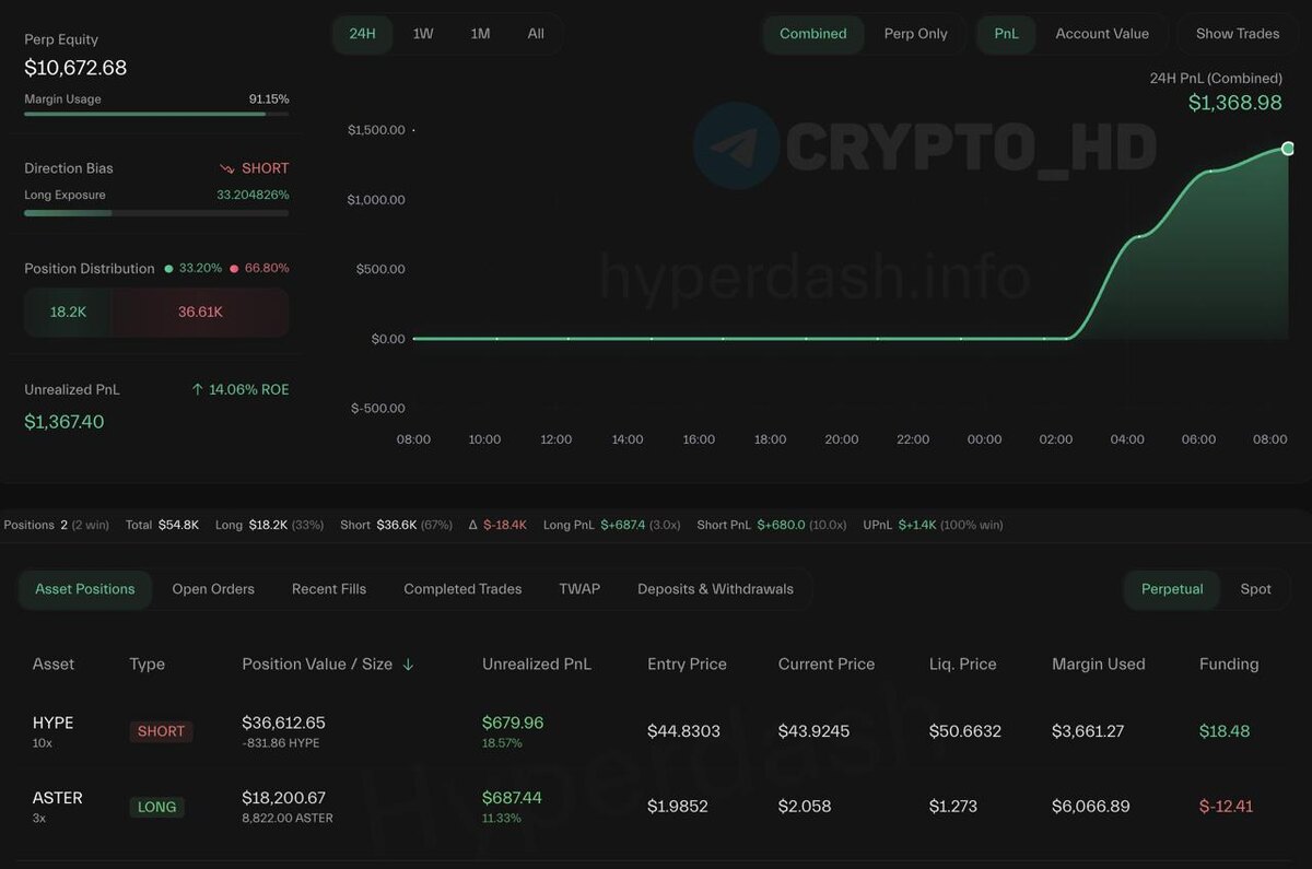 🧐 Джеймс Уинн «наскреб» $8032 с рефералок Hyperliquid и сразу зашел в лонг по #ASTER, одновременно открыв шорт по #HYPE