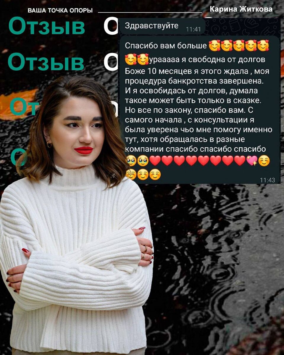 Как всё начиналось (ссылка на отзыв 👉https://t.me/c/1924388521/804) Галина никогда не думала, что окажется в долговой яме. Всю жизнь она проработала учителем, привыкла жить по средствам. Но болезнь мужа перевернула их жизнь с ног на голову. Дорогостоящее лечение, операции, реабилитация – расходы росли как снежный ком. Сначала были займы у знакомых, потом кредиты в банках, а когда банки отказали – микрозаймы под огромные проценты. "Я брала новые кредиты, чтобы закрыть старые. Это было похоже на замкнутый круг, из которого я не видела выхода", – вспоминает Галина. Момент перелома Когда сумма долга достигла 928 684,61 рублей, а денег едва хватало на еду и коммунальные платежи, Галина поняла – нужно что-то менять. Она обращалась в разные юридические компании Путь к свободе На первой же консультации внимательно выслушали историю Галины и предложили чёткий план действий. "Меня поразило то, как спокойно и уверенно говорили о моей ситуации. Впервые за долгое время я почувствовала над