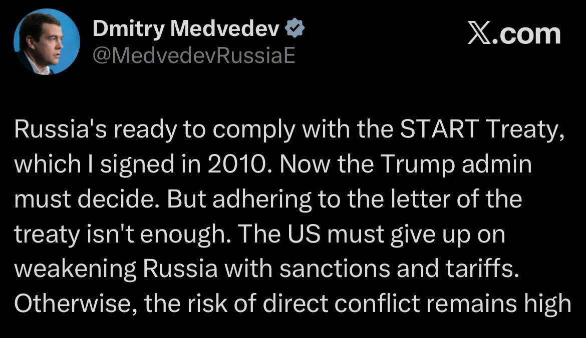 Дмитрий Медведев считает, что США должны прекратить давление на Россию. Замсекретаря Совета безопасности РФ предупредил о рисках прямого конфликта России и Америки. Мы готовы соблюдать Договор СНВ, который я подписал в 2010 году. Теперь решение должна принять администрация Трампа. Но просто следовать букве договора недостаточно. США должны отказаться от ослабления России санкциями и пошлинами. В противном случае риск прямого конфликта остается высоким, — написал Дмитрий Медведев в соцсети Х.