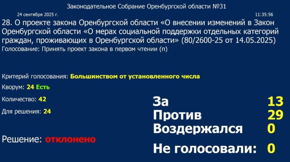 В Оренбуржье в очередной раз отказали "детям войны" в мерах социальной поддержки: лишь 13 народных избранников выступили за, 29 - против