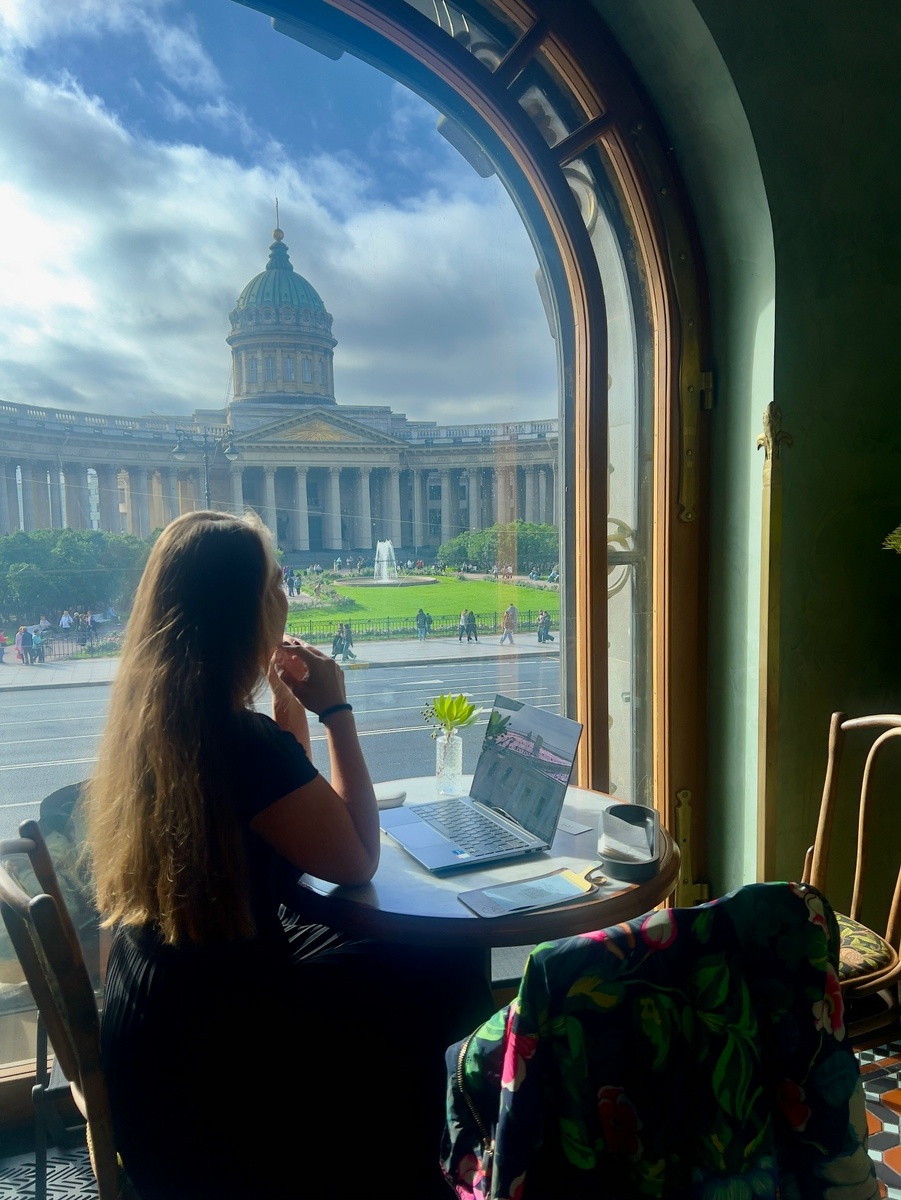 ТО САМОЕ кафе с видом на Казанский! Попасть сюда не просто. Точнее, непросто попасть за столик у окна. Придется либо стоять живую очередь (которая в выходные может тянуться аж до середины зала), либо бронировать заранее. Но тут тоже - дело такое: за две недели ДО планы и поменяться могут. Я действовала решительно: пришла в 10 утра, оценила обстановку (очереди на столик "для одного", а в зале у окон допивали кофеек парочка бабушек) и дождалась! Впечатления от интерьера - отличные: будто ты в нашем веке, но как будто бы и нет. В глубине зала стоит рояль, на вид вполне функциональный. Ценник для ресторана в Питере мне показался обычным. Салатик - от 750 руб, горячее - от 1500 руб. Капучино - вкусный! Прямо - таки добротный - за 370 руб. Идти ли не идти? Однозначно - да. За настроением и ощущениями.