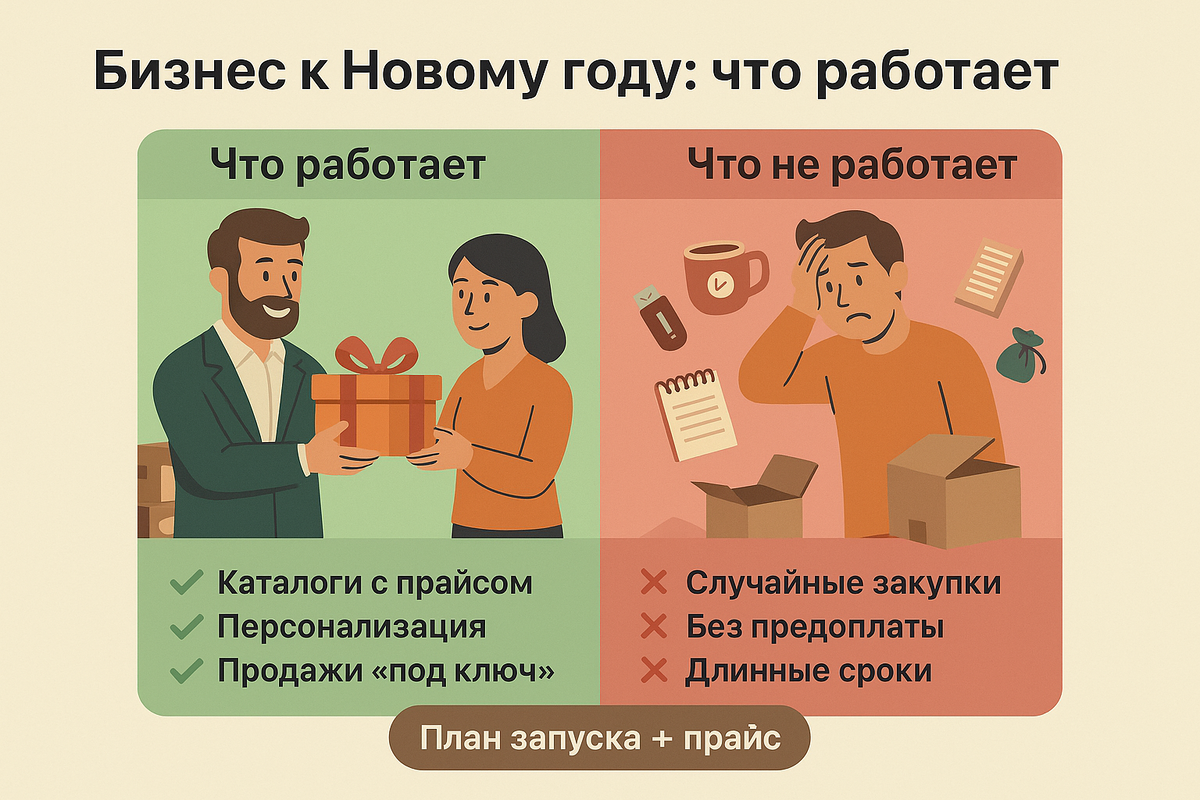 Новогодний сезон приносит компаниям головную боль — нужно закупить подарки сотрудникам и партнёрам, но времени искать поставщика нет. Для предпринимателей это шанс заработать на готовности платить за решение "под ключ". За 60 дней активных продаж можно получить выручку от 300 до 800 тысяч рублей при правильном подходе.