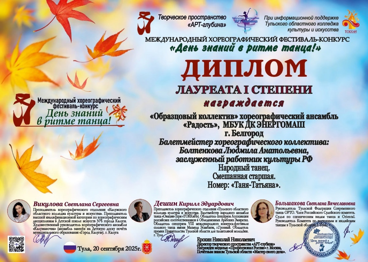 Поздравляем народный коллектив хореографический ансамбль «Радость» Дворца культуры «Энергомаш» с победой на Международном хореографическом фестивале-конкурсе «День знаний в ритме танца» ! 🎉 Выражаем благодарность руководителю коллектива, Заслуженному работнику культуры РФ Людмиле Болтенковой, чьи профессиональные знания и преданность делу позволили ансамблю достичь высоких результатов и признания далеко за пределами родного региона. Коллектив продемонстрировал высочайший уровень мастерства и ярким примером творческого потенциала нашего края. Этот успех вдохновляет и мотивирует продолжать развивать танцевальное искусство, сохраняя культурные традиции и воспитывая новое поколение талантливых артистов. Желаем дальнейших побед, вдохновения и новых свершений в творчестве!