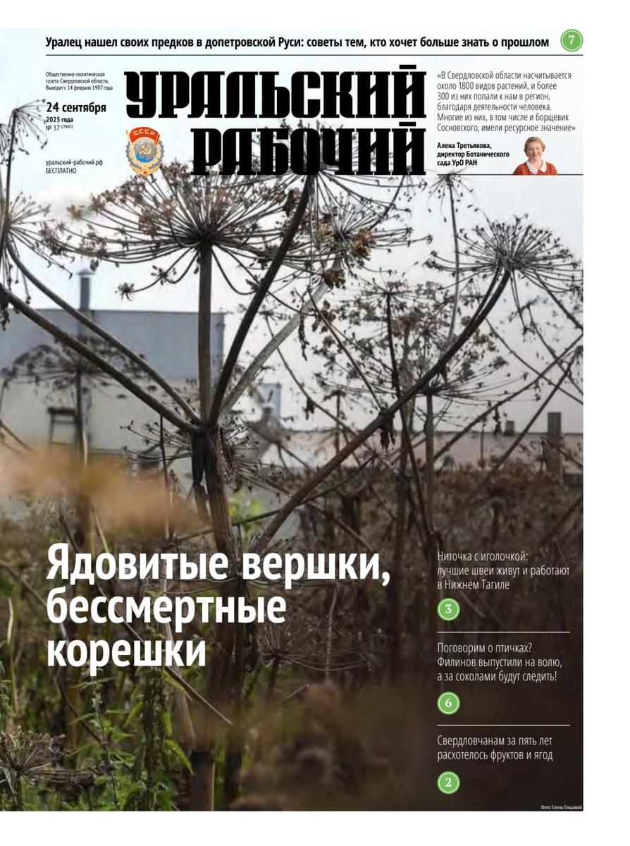 Свежий выпуск газеты Читайте в номере: Ядовитые вершки, бессмертные корешки Как борщевик Сосновского отравляет жизнь свердловчан. Ниточка с иголочкой: лучшие швеи работают в Нижнем Тагиле В конкурсе профмастерства «Золотая нить» пьедестал заняли конкурсантки из одного ателье. Поговорим о птичках? Три молодых филина, выращенные в вольере, выпущены на волю. А за соколом-сапсаном установят наблюдение. Свердловчанам за пять лет расхотелось фруктов и ягод Жители Свердловской области стали потреблять больше картофеля, мяса и яиц. Нашел предков в петровской эпохе Интервью «УР» с уроженцем Красноуфимска, нашедшим свою родню до XVII века. Мужчина поделился успехом, и дал советы, с чего начинать генеалогические поиски.
