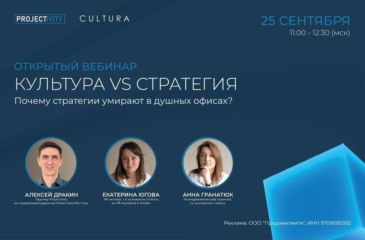 25 сентября | 11.00 - 12.30 Открытый вебинар Online Зачастую цели и планы компании, прописанные на бумаге уходят «в стол», а красивые лозунги остаются исключительно на слайдах и в отчётах. Данный вебинар - наша честная попытка ответить на вопрос: Что становится стоп-факторами для реализации бизнес-стратегии. Что вы получите: 🔸Факты и статистика — реальные данные от российских и международных компаний. 🔸Живой кейс — вместе разберём, как превратить саботаж в драйвер изменений. 🔸 Индекс «духоты» ™ — наша уникальная разработка. Как понять, почему инициативы глохнут. Для кого: ➡️Топ-менеджмент, задающий стратегический вектор своей компании ➡️C-level как прямой реализатор бизнес-стратегии ➡️HR-бизнес-партнеры, HRD и другие хранители корпоративной культуры Ведущие вебинара: 🔸 Алексей Дракин - партнер PROJECTIVITY: ex. ген. директор Parker Hannifin Russia 🔸Анна Гранатюк – психодинамический психолог, со-основатель CULTURA 🔸 Екатерина Югова - HR-эксперт, со-основатель CULTURA, ex-HR-teamle