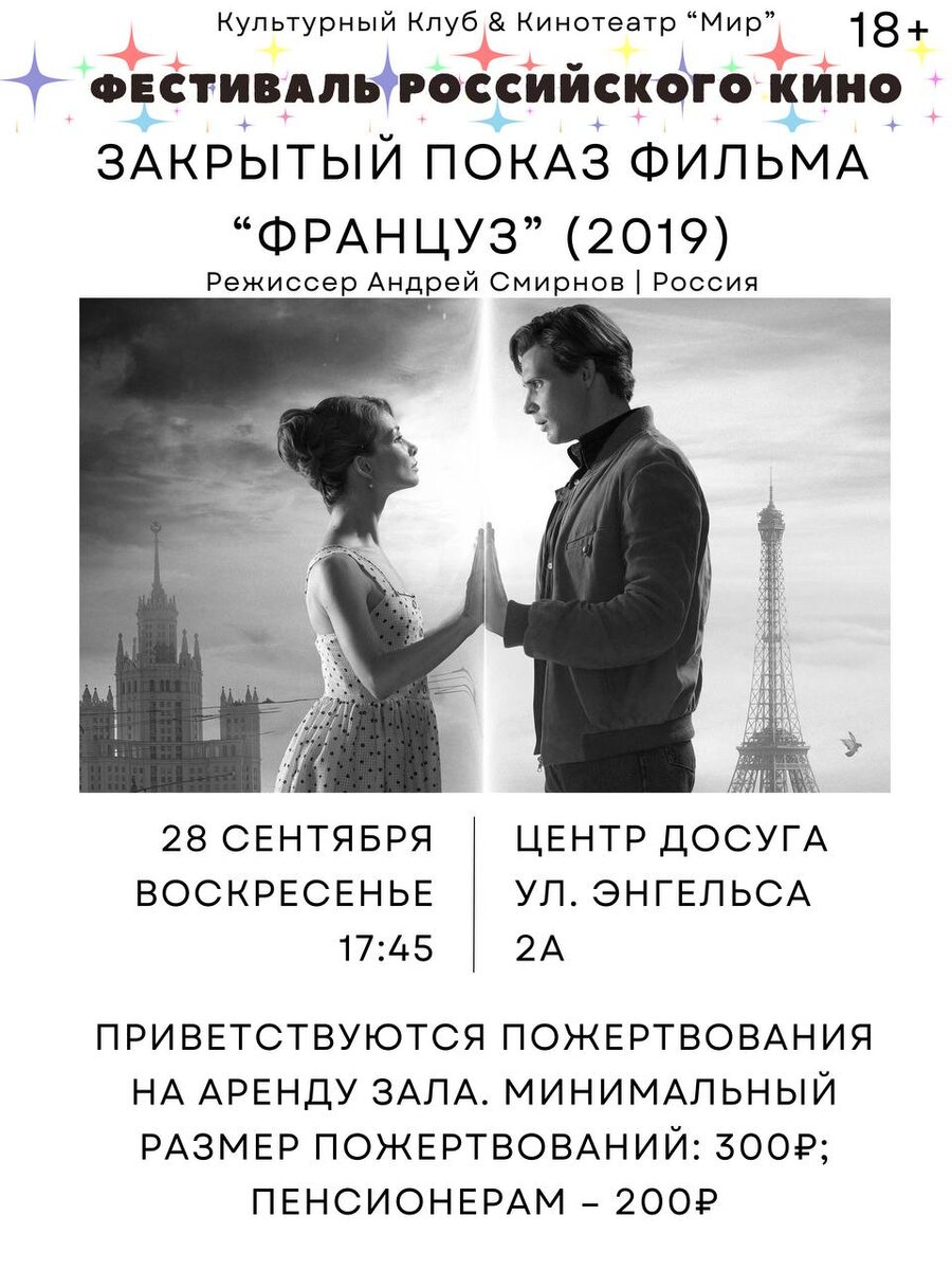 Культурный Клуб приглашает на закрытый показ фильма «Француз» (2019), режиссера Андрея Смирнова, который состоится в рамках нашего Фестиваля российского кино. Когда: 28 сентября, в воскресенье, в 17:45 Где: Центр досуга, ул. Энгельса, 2а Продолжительность фильма: 2 часа 8 минут Тонкое, лиричное, красивое, щемящее, чёрно-белое кино в духе шестидесятых годов прошлого века. С уютом разговоров, забавными и узнаваемыми сценками, улыбками, первыми влюблённостями, ревностью, подпольным джазом, ощущением праздника, воодушевлением начала оттепели, разочарованиями и ужасом прозрения… Очень медленно из всего это выплывает Отец. Тот, кого ищет на самом деле главный герой. Вход за пожертвования. Они идут на аренду зала. Минимальный размер пожертвований: 300₽, пенсионерам – 200₽ До встречи! Не забудьте пригласить друзей 👋 👍 Подписаться | Ваша реклама