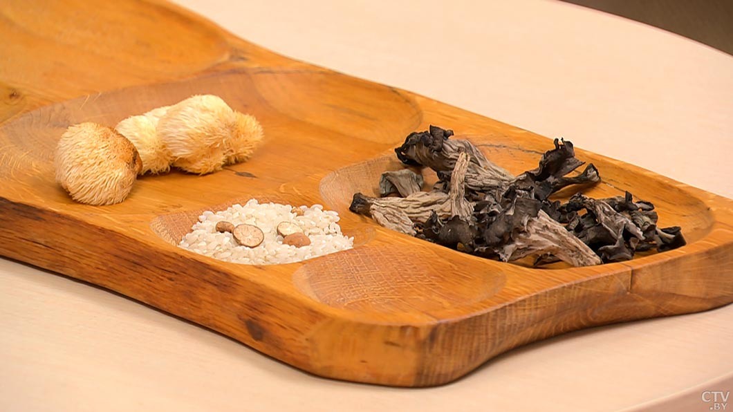 На столе – то, чего Не может быть. Ежовик гребенчатый не был зарегистрирован в Беларуси за всю историю. В гербарии нет сушеного плодового тела. Я позавчера нашел, забрал эти грибы. Они прямо из студии поедут в Академию наук. Также есть рыжий трюфель. Это третичный реликт. Это то, что не поменялось с третичного периода – 2 миллиона лет назад. Он был найден впервые! Это девятый вид трюфеля, который есть в Беларуси есть. Он был впервые найден в 2016 году в Беловежской пуще, а мы нашл