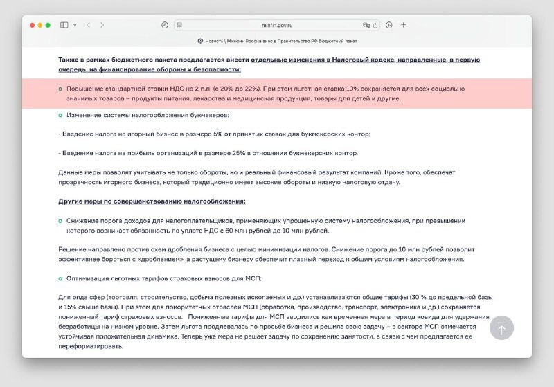Министерство финансов готовит повышение цен: НДС могут увеличить на два процентных пункта — до 22%. Законопроект уже разработан и передан в правительство. Это приведет к тому, что цены на большинство товаров возрастут. Исключение составят лекарства, детские товары и другие социально значимые категории, для которых останется льготная ставка в 10%. Если изменения будут приняты, они начнут действовать с 1 января 2026 года. Дополнительную информацию можно найти на сайте Минфина. Постмейкер - автоматическое ведение канала 🤖 Анимация | СhatGPT-4 | Помощь с резюме
