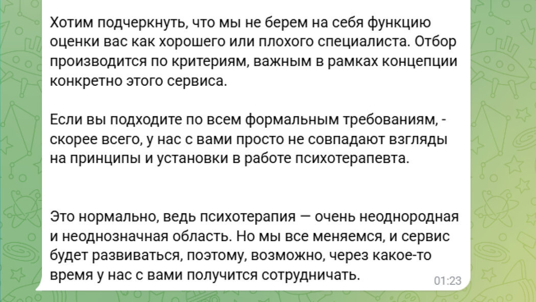Короче, полный провал. Обратную связь с отказом мне прислали через полторы недели. Я, конечно, ни на что и не надеялась, но, как и всегда, отказ сильно задевает самолюбие, как к нему не готовься)