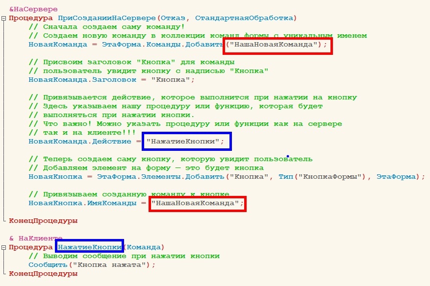 НаСервере Процедура ПриСозданииНаСервере(Отказ) // Создаётся новая команда в коллекции команд формы с уникальным именем НоваяКоманда = ЭтаФорма.Команды.Добавить("Команда1"); // Устанавливается заголовок команды, который будет отображаться на кнопке НоваяКоманда.Заголовок = "Кнопка"; // Привязывается действие, которое выполнится при нажатии на кнопку НоваяКоманда.Действие = "НажатиеКнопки"; // Добавляем элемент на форму — это будет кнопка НоваяКнопка = ЭтаФорма.Элементы.Добавить("Кнопка", Тип("КнопкаФормы"), ЭтаФорма); // Привязываем созданную команду к кнопке НоваяКнопка.ИмяКоманды = "Команда1"; КонецПроцедуры & НаКлиенте Процедура НажатиеКнопки(Команда) // Выводим сообщение при нажатии кнопки Сообщить("Кнопка нажата"); КонецПроцедуры