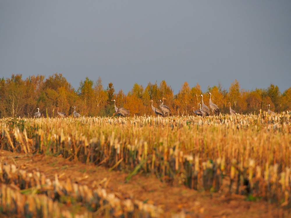 Свой рассказ о повторной поездке на поиски журавлей прервал на том, что добрался до того места, где нахождение журавлей было весьма вероятным. Это скошенные кукурузные поля. Я услышал крики журавлей и направился в ту сторону. Двигался по краю поля, журавли кричали громко, что говорило об их близости. И тут в окно машины неожиданно их увидел. Были они совсем рядом, машину заметили и насторожились. Чтобы не вспугнуть, фотографировал прямо через опущенное стекло. Журавли вели себя достаточно спокойно. По опыту наблюдения за ними знаю, что автомобилей они боятся меньше, чем людей. Так продолжалось несколько минут. Даже снял небольшое видео. Но журавли все-таки взлетели и с криком покинули это место. Но не все поднялись в воздух, несколько птиц еще оставались на поле. Если приглядеться, то можно увидеть их головы, сливающиеся с обрубками кукурузных стеблей. Журавли скрылись за горизонтом, но крики их продолжали доноситься. Продолжил движение по полю, и на границе где скошена кукуруза снова