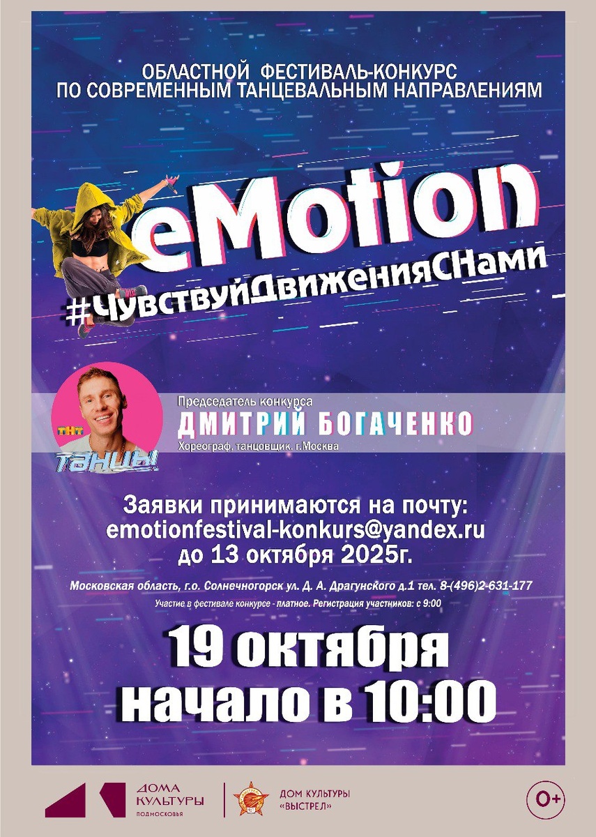 💥19 октября в Доме культуры "Выстрел", г. Солнечногорск, состоится ОБЛАСТНОЙ ФЕСТИВАЛЬ-КОНКУРС ПО СОВРЕМЕННЫМ ТАНЦЕВАЛЬНЫМ НАПРАВЛЕНИЯМ. ВНИМАНИЕ! Всем танцорам и поклонникам хореографии! Приготовьтесь зажигать! 🔥 💫Председатель жюри - хореограф, организатор Забайкальского фестиваля танца «Manula Dance Fest», победитель различных танцевальных чемпионатов и фестивалей, участник шоу «Танцы на ТНТ», преподаватель центра «ProТанцы. Север» - ДМИТРИЙ БОГАЧЕНКО. Это твой шанс: ✅ Показать себя лучшему из лучших. ✅ Получить оценку и советы от настоящего профи индустрии. ✅ Сделать шаг к большой сцене. Дмитрий знает о движении всё, и он ждёт именно тебя! Не упусти возможность быть замеченным. Заявку можно подать до 13 октября на электронную почту: emotionfestival-konkurs@yandex.com ➡️ ПОЛОЖЕНИЕ И ЗАЯВКА: clck.ru/3PJd6m ➡️ ПОЧТА ДЛЯ ПОДАЧИ ЗАЯВКИ: emotionfestival-konkurs@yandex.com По всем вопросам звоните организаторам: 89262602523 – Карымшакова Светлана Юрьевна; 89151060188 – Трухина Лилия