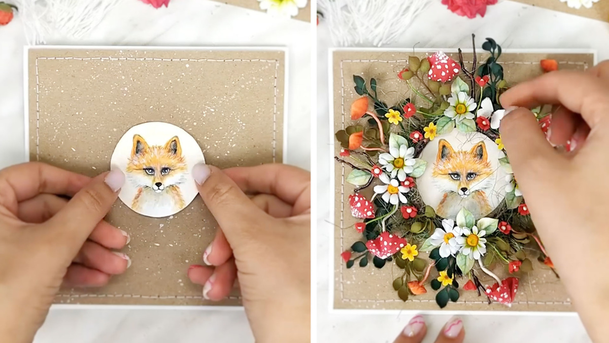 Приглашаю вас в мою творческую мастерскую, где вас ждет завораживающий процесс создания открытки с лисенком, грибочками, цветами и другими миниатюрными деталями, которые я делала с нуля.