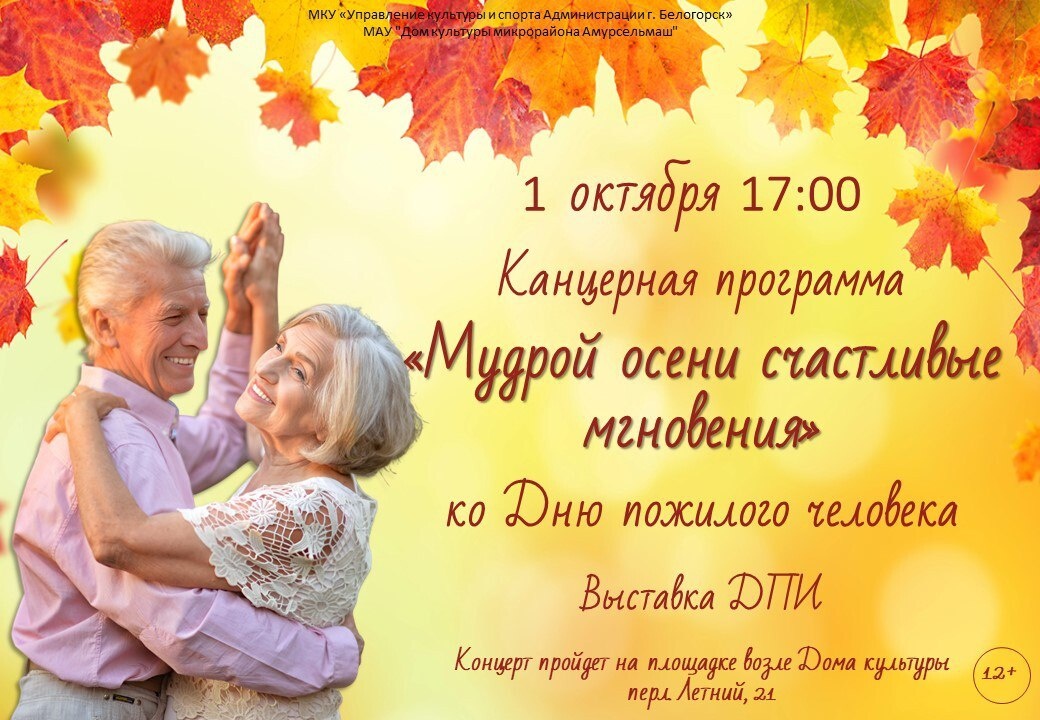 В Белогорске состоится праздничный концерт «Счастливые мгновения мудрой осени», посвящённый Дню пожилого человека. Мероприятие пройдёт 1 октября на площадке у Дома культуры «Амурсельмаш». Начало в 17:00. — Гостей праздника ждут душевные песни, зажигательные танцы, зрелищные цирковые номера и выставка декоративно-прикладного творчества «Живём и творим», — рассказала директор ДК «Амурсельмаш» Маргарита Терещенко. — Это прекрасная возможность не только насладиться выступлениями талантливых артистов, но и провести время в кругу друзей, потанцевать и зарядиться хорошим настроением. Не пропустите! Мы будем рады видеть вас!
