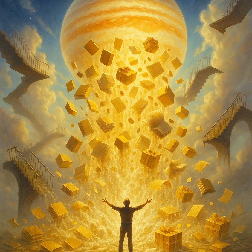 Юпитер часто воспринимают как планету подарков и удачи, но это половина картины. Он приносит не только возможности, но и проблемы — и дело не в том, «гармоничный» он или «поражённый». Любое расширение несёт в себе риск перегиба, а Юпитер умеет перегибать мастерски: там, где хотелось роста, получается перегрузка, а там, где ждали щедрости, приходит расточительность. В жизни это проявляется очень конкретно. Человек с сильным Юпитером может учиться без конца: курсы, дипломы, сертификаты — шкафы ломятся от книг, а голова от знаний, но использовать всё это негде. В работе это похоже на вечное «раздувание» — проектов много, обещаний ещё больше, а доведённых до конца дел единицы. В финансах Юпитер часто даёт не заработок, а траты: щедрые жесты, кредиты «на развитие», покупки «для будущего», которые потом становятся грузом. В отношениях — та же схема: обещания великого счастья и широких перспектив, но реальных действий и ответственности не хватает. Самая коварная особенность Юпитера — иллюзия