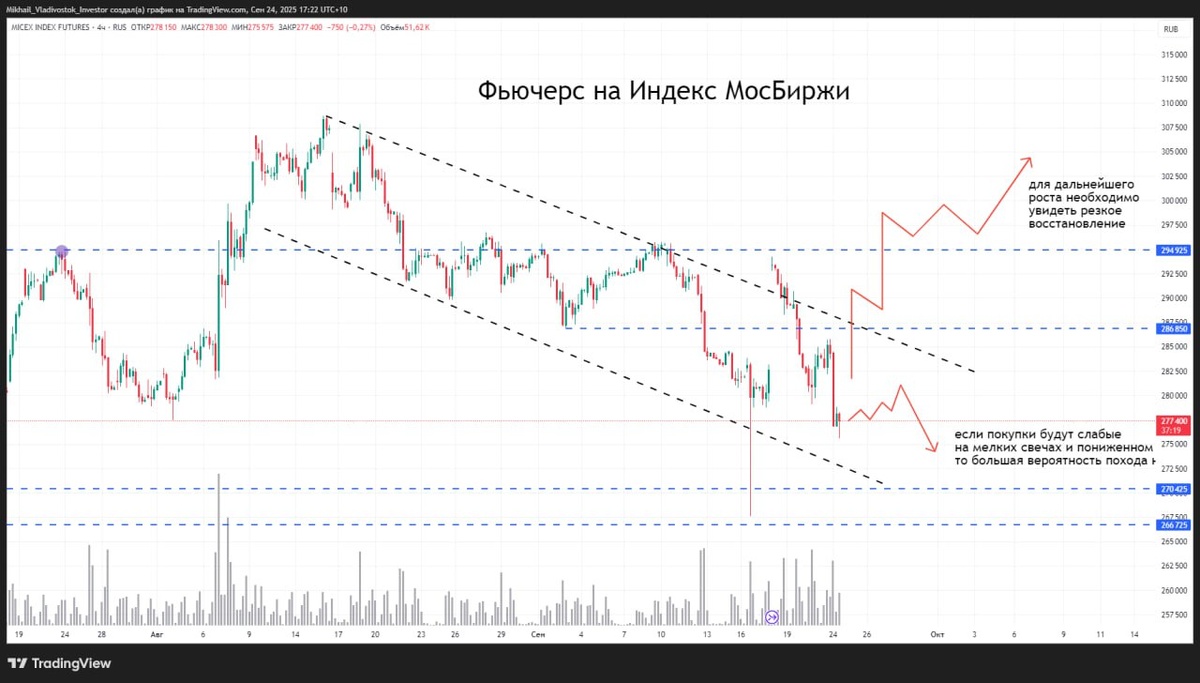 - Начинаем основную сессию с падения. Фьючерс на Индекс Мосбиржи $MXU6 -2,5%. Если слабо восстанавливаемся на мелких свечах и пониженном объеме, то можем снова пойти тестировать минимумы.